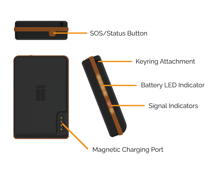 | 1-3 second | The battery LEDs will flash from left to right in a cycle, and you will hear a small beep. | Send button press event & location | Initially sending an immediate location, followed by a more accurate location once found. |